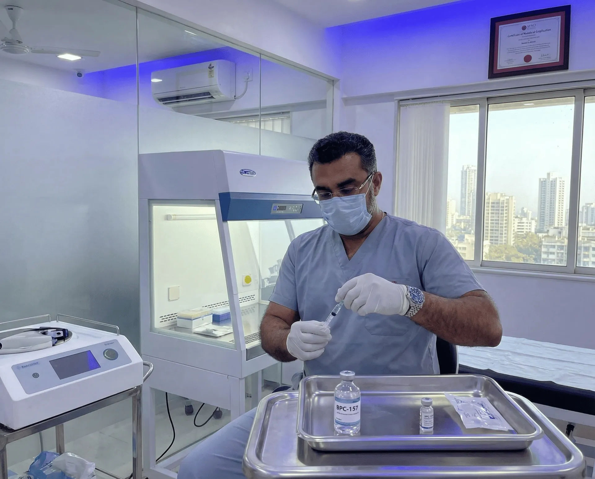 See are peptides available in India for the full context. At The Sculptique Aesthetics we source medical-grade BPC-157 through appropriate channels and administer it under clinical supervision.
